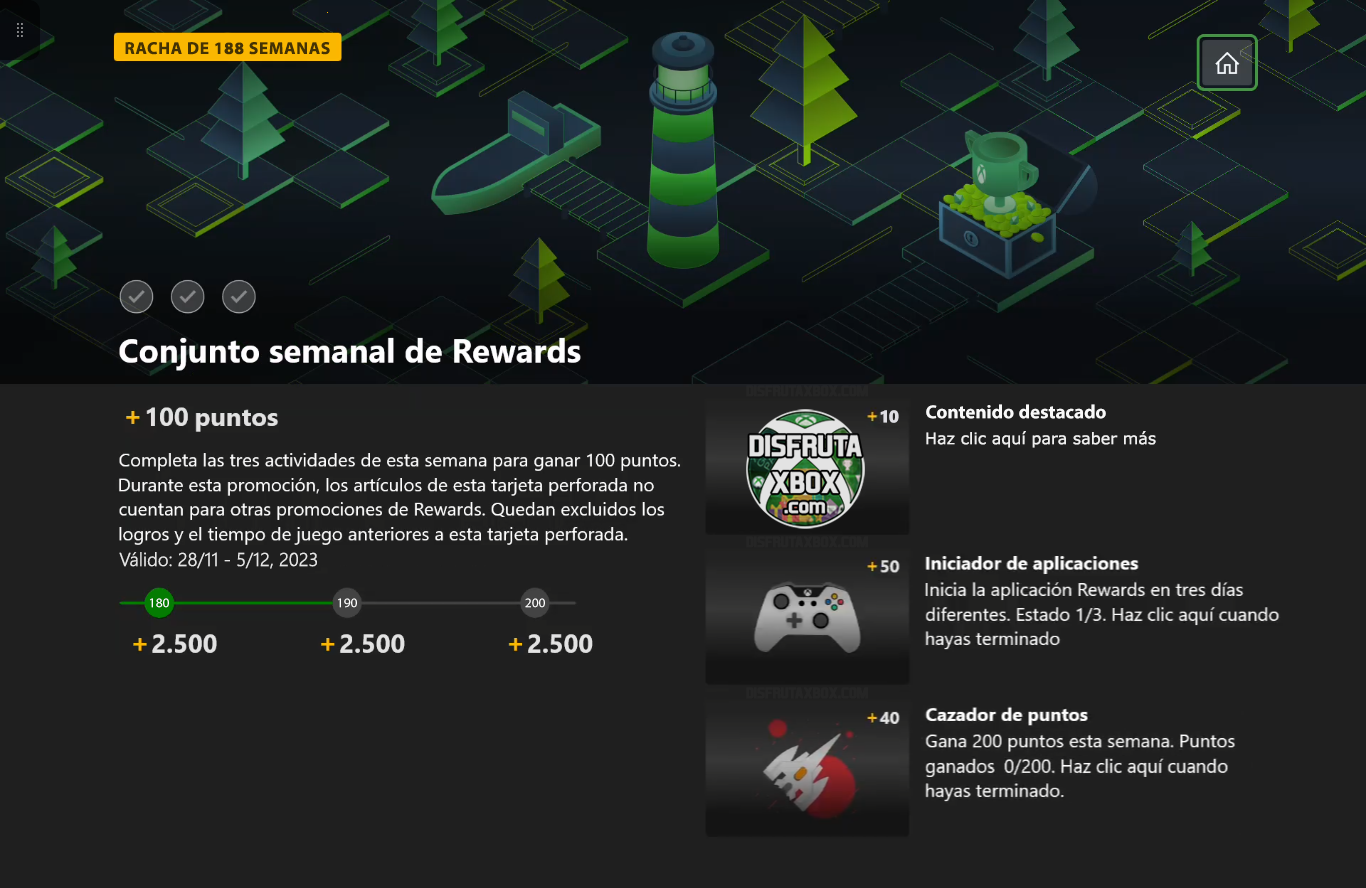 - Abrir la aplicación Rewards en la Xbox 3 veces durante la semana en dÃas diferentes, no necesariamente de manera consecutiva. Y entrar al conjunto para validarlo.